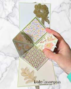 On the inside are three pop up panels (insired by Susan Campfield) with Stylish Shapes die cuts and another vase of flowers coloured the same way as on the front. The other two are Basic White with the same watercoloured stripes across them. On hhe right is a 1″ strip of Smoky Slate dry embossed with the same folder as on the front.
