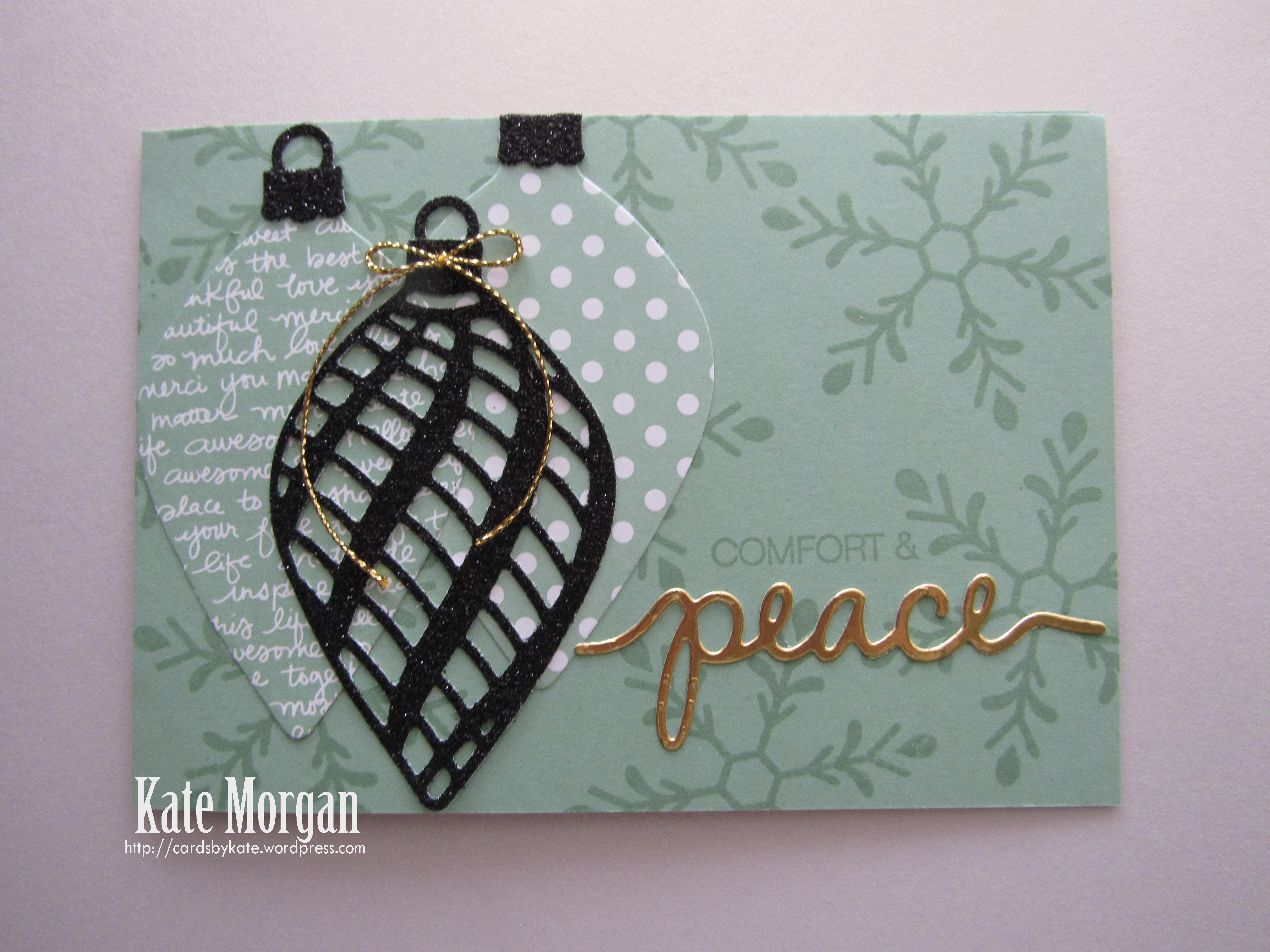 My card base is Mint Macaron cardstock stamped with the coordinating inkpad. The sentiment is die cut from gold foil and the baubles are die cut from Black Glimmer Paper and the In Colour Paper stack.