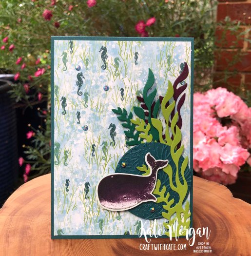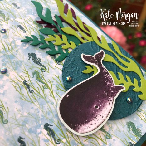 I love how these designer papers add such a wow to a card, with very little extras needed. This gorgeous piece with the sea horses makes a super cute backdrop for this whale card.