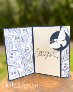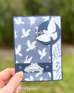 This handmade sympathy card features the Peace on Earth bundle and the Peaceful Garden Designer Series Paper (DSP) in a very easy fun fold design. The narrow panel on the right folds back to open the card, with the circle feature holding the card closed. This fold is so versatile to use with any of the beautiful Stampin’ Up! Designer Serie Papers.