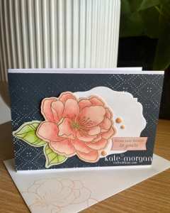The flower is added on Dimensionals and the leaves tucked under with Tombo Multipurpose Glue. The sentiment [Greetings for You Mix & Match Ephemera] has some Petal Pink ink blended over it applied with a Blending Brush. The cover paper on the back is removed and it is adhered to the card. ‘From our home to yours‘ is such a great sentiment that could be used for any occasion eg sympathy, birthday, Mother’s Day.