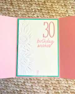 On the inside is a Summer Splash layer with a Basic White layer partially embossed with the Sunflower 3D EF (and the side on the envelope as you can see in the first pic). The sentiment [Simply Said] is stamped in Pretty in Pink and the numbers [Alphabet A La Mode dies] added at the top.