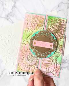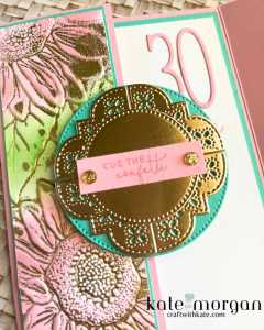 The front feature is a Summer Splash circle [Stylish Shapes dies] with Gold Foil pieces [Beautifully Celebrated dies] adhered with another circle of Gold Foil onto top. The sentiment [Banner Sayings] is stamped onto the same colour card and cut out using the Three Banner Punch. This is adhered on Dimensionals, but only place them on one half of the circle.