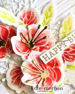The flowers and leaves are stamped in Versamark ink on Watercolor paper, Clear Embossing Powder added and melted with my Heat Tool. These are then watercoloured using Real Red and Lemon Lime Twist inks & water with a brush, then diecut with the coordinating dies. Some more foliage is diecut with Basic White card and Vellum. The stamen are cut in Vellum & Gold Foil. The Simply Said sentiment is Gold Heat Embossed. You can also see some delicate threads, these are the Gold Twisted Thread that I unravelled. Wink of Stella is splatted by lightly tapping it against a Bone Folder.