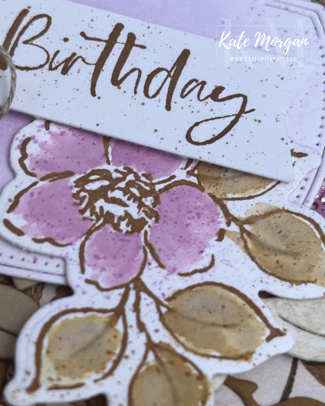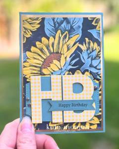 This piece is mounted onto some Brushed Metallic cardstock then onto a Lost Lagoon card base. A label is diecut from Lost Lagoon card using the Branching Out dies and the ‘H’ ‘B’ is diecut from the Floral Delight Designer Series Paper using the Party Alphabet dies. The sentiment is from the new Banner Sayings Bundle, comprising a stamp set and the Three Banner Punch.