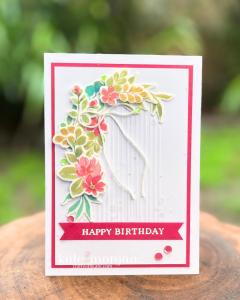 The flowers were adhered to the card first, then the leaves popped underneath. I added a big splatter of Wink of Stella across the entire card and put it aside to dry.