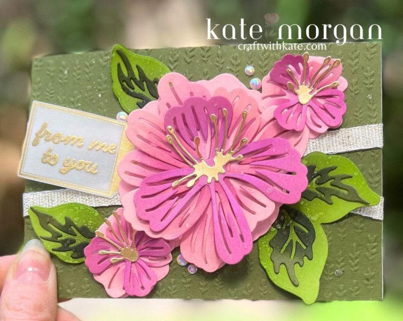 The leaves are die cut from Granny Apple Green & Mossy Meadow cardstock and the flowers in Pretty in Pink & Petunia Pop cardstock and the stamen in Gold Foil. Each of these layers has some ink blending using Blending Brushes and the coordinating ink colours, then each layer glued together.