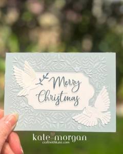 Start with a Cloud Cover card base, 29.7cm x 10.5cm, scored @ 14.8cm. Dry emboss the card front with the Peaceful Greenery 3D Embossing Folder. Die cut a Basic White label, stamp the sentiment [Traditional Labels stamp set] in Misty Moonlight ink and again in Cloud Cover ink but slighty offset to create a shadow effect. Adhere it to the card. Die cut the doves and envelopes in Basic White and the branch is cut from some Peaceful Garden Glimmer.