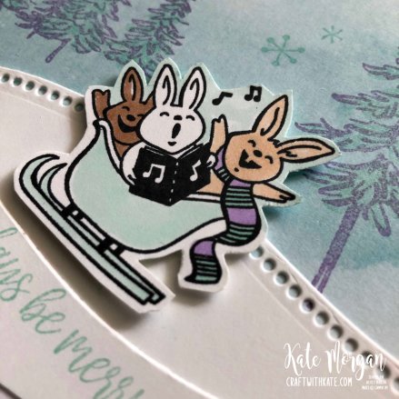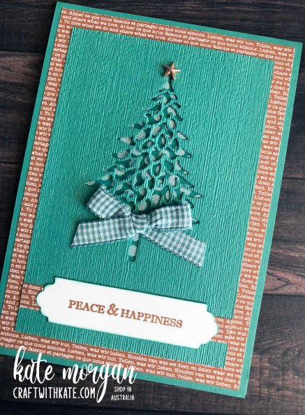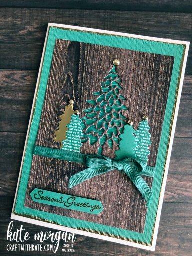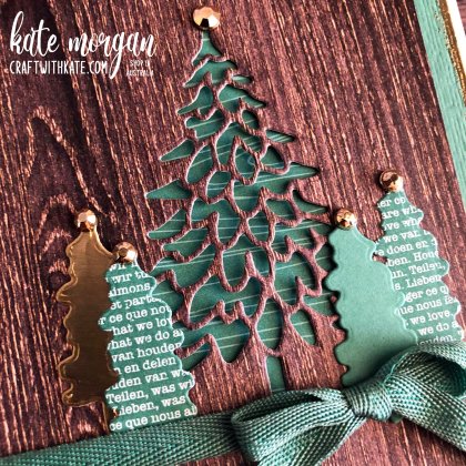 The Just Jade Ribbon is tied around the woodgrain layer, and in a bow, before it is adhered to the Just Jade card layer. Then add the smaller trees last.