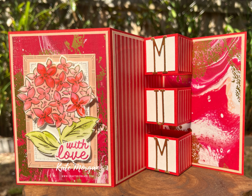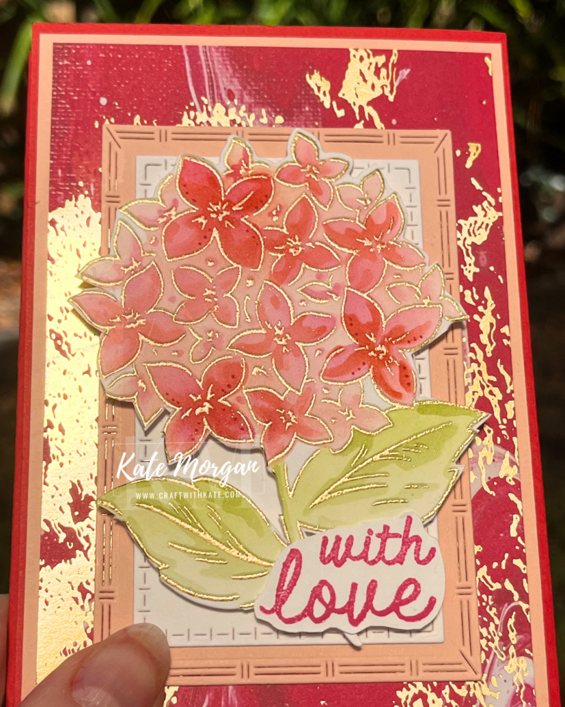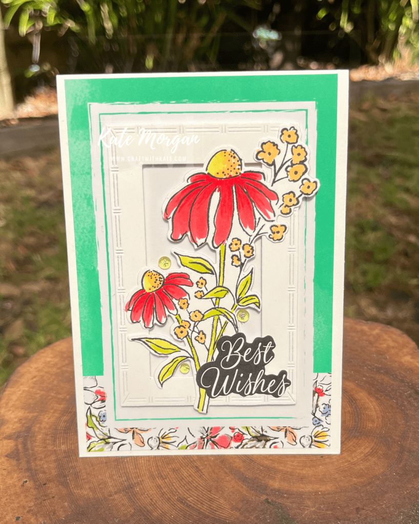 Card 2 – is a stepped up verion with the other main image in the Mixed Florals bundle. Adding some On the Go DSP (right) & 2024-26 In Color™ DSP (left) with the stamped/die cut image on top on Dimensionals. I also added the white diecut behind for added interest. Using Stampin’ Blends Combo markers in Calypso Coral, Poppy Parade, Summer Splash & Shy Shamrock to colour it.