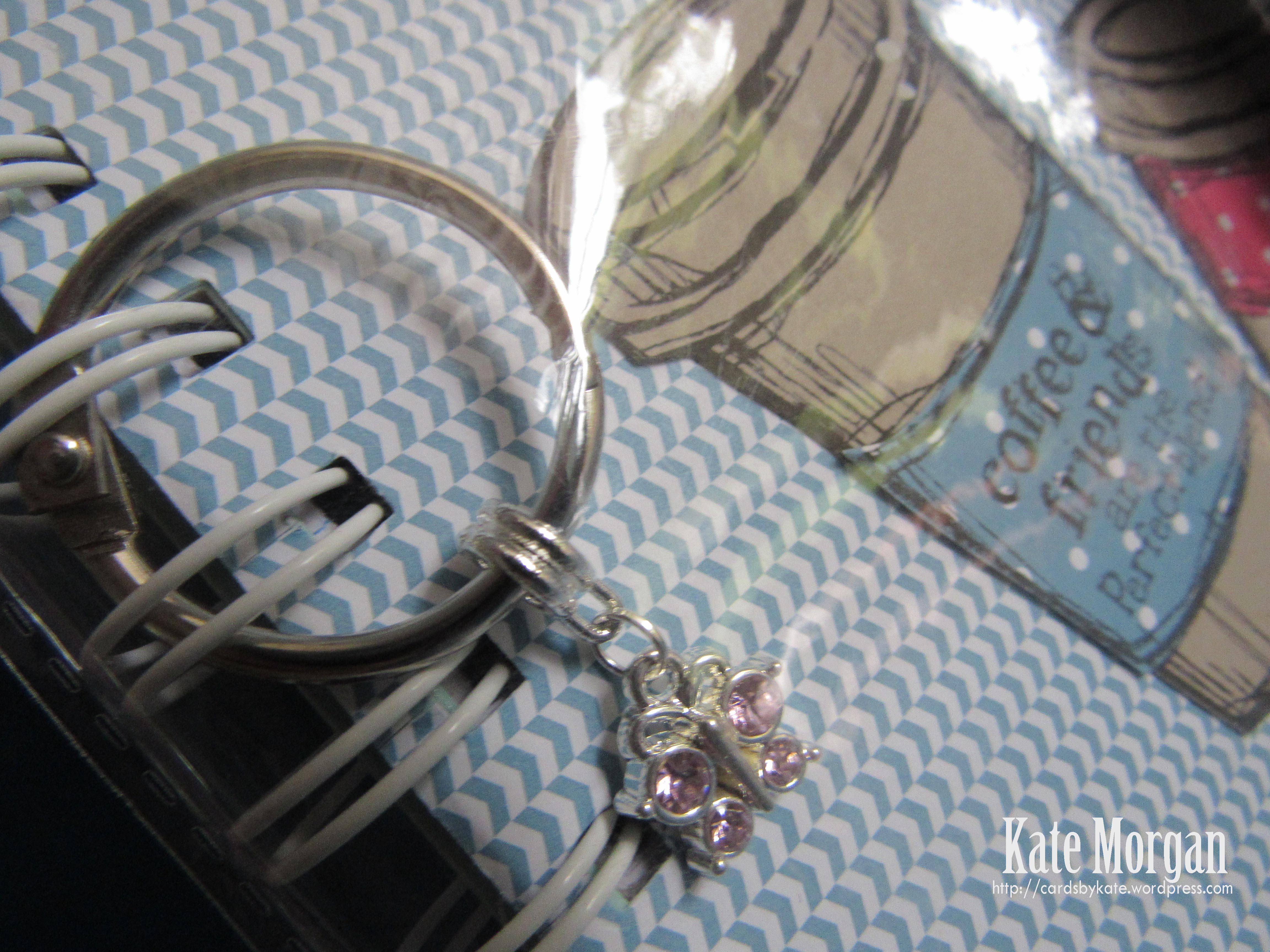 The stand is stamped in Versamark ink and heat embossed with gold emboss powder. I coloured part of it with the Stampin Write Marker. I layered some Coastal Cabana card and white card with a 1-3/4″ circle punch. These layers were all sponged around the edges with a dauber.