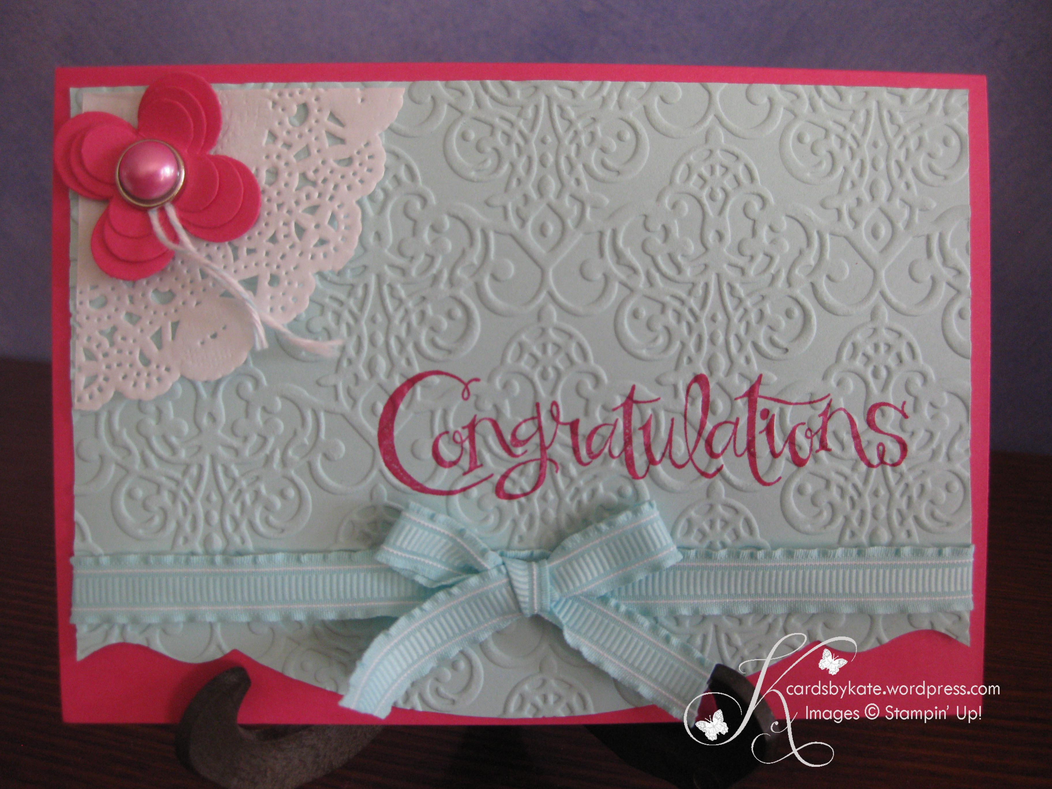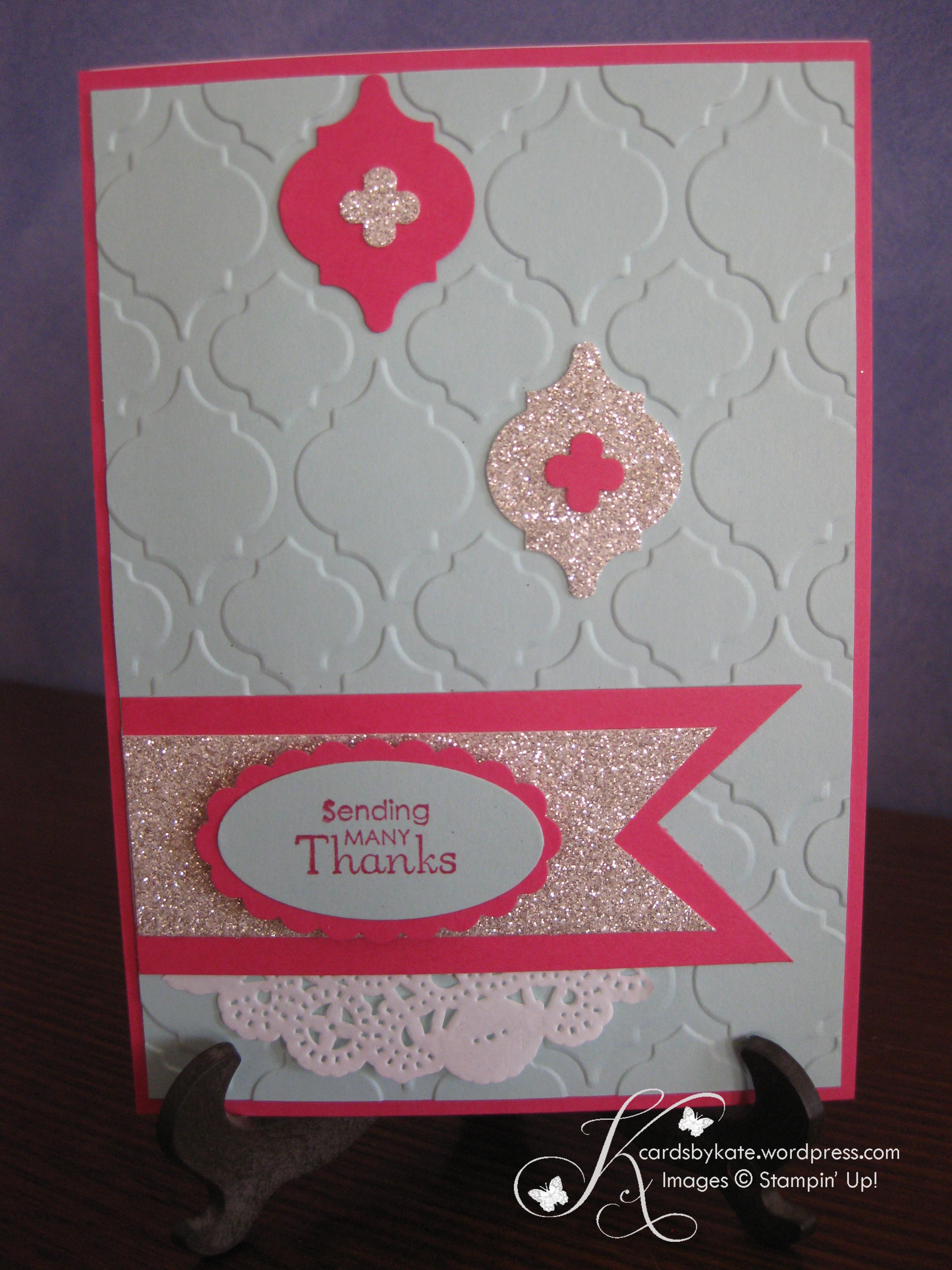 I have used Crisp Cantaloupe as my card base. I stamped the I Love Lace background stamp with Versamark Ink onto Crisp Cantaloupe card stock and applied gold embossing powder being heat setting it. How gorgeous does it look? Check out that shine!