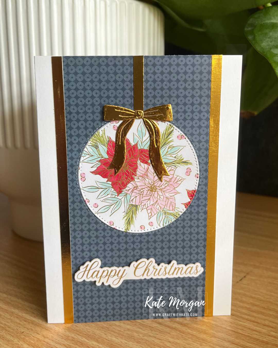 3. Add the sentiment – Stamp the sentiment [Traditional Labels stamp set] in Cherry Cobbler ink onto a Basic White Stylish Shapes die cut circle. Die cut another circle one size bigger in Gold Foil to place behind the sentiment one. These are added to the card on Dimensionals.