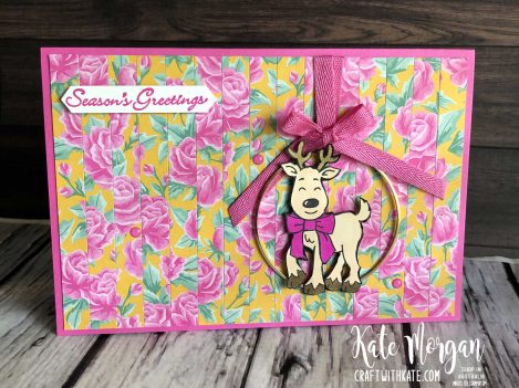 This reindeer is so cute coloured with Stampin’ Blends Markers and Wink of Stella added to the bow and nose for some sparkle. The Gold Hoop has some ribbon tied around it and up over the top of the layered card. The bow was tied separately and added with a glue dot. The reindeer and sentiment are popped up on dimensionals.